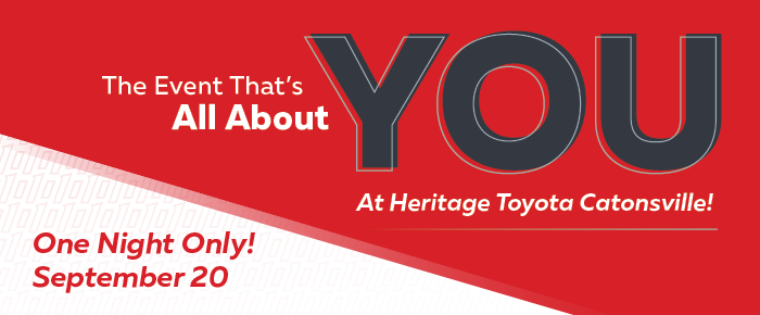 We appreciate YOU as a valued Heritage Toyota customer! And, rather than just say it, we want to celebrate it! Bring in your Toyota on September 20 fromĀ 6-9 pm for an evening of seriously cool stuff for YOU (and your Toyota).Ā